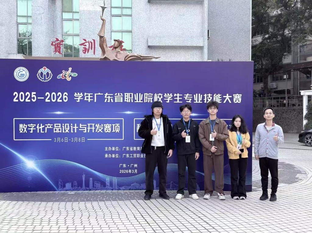 2026年3月6日至8日,广东省职业院校技能大赛“数字化产品设计与开发 ”赛项在广东工贸职业技术学院火热举行。我院师生代表积极参赛,与来自全省各职业院校的58支队伍选手同台竞技。我院梁健民老师带领24级学生黄开和、江东耿和25级冼家怡、何键四位同学组成代表队参加了本次竞赛。