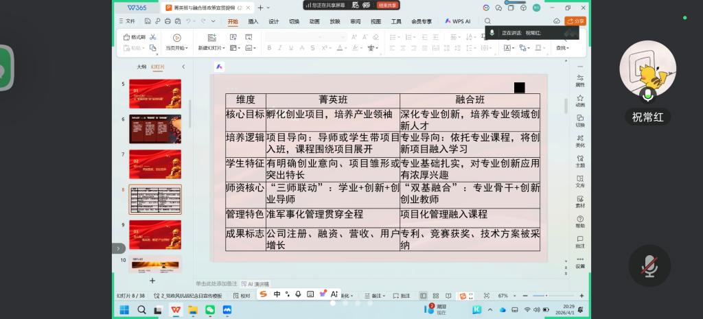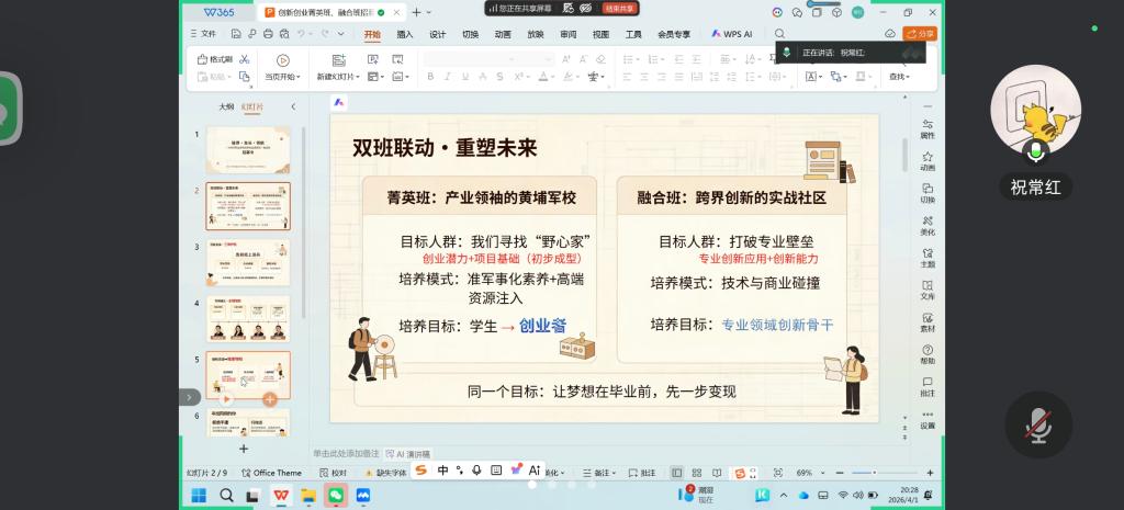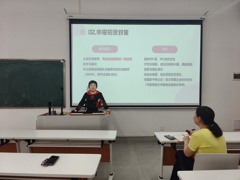 4月1日下午,低空物流技术学院院长祝常红通过“线上+线下”相结合的方式,主持召开了两班招生宣传专题动员会。全院教师齐聚一堂,分会场及未能到场的教师通过视频同步参会。会上,院长带领全体教师逐条研读学校文件,重点剖析了“菁英班”与“融合班”的核心定位与差异化优势。她强调:“菁英班聚焦跨学科创业领军人才,融合班立足专业赛道挖掘创业项目。