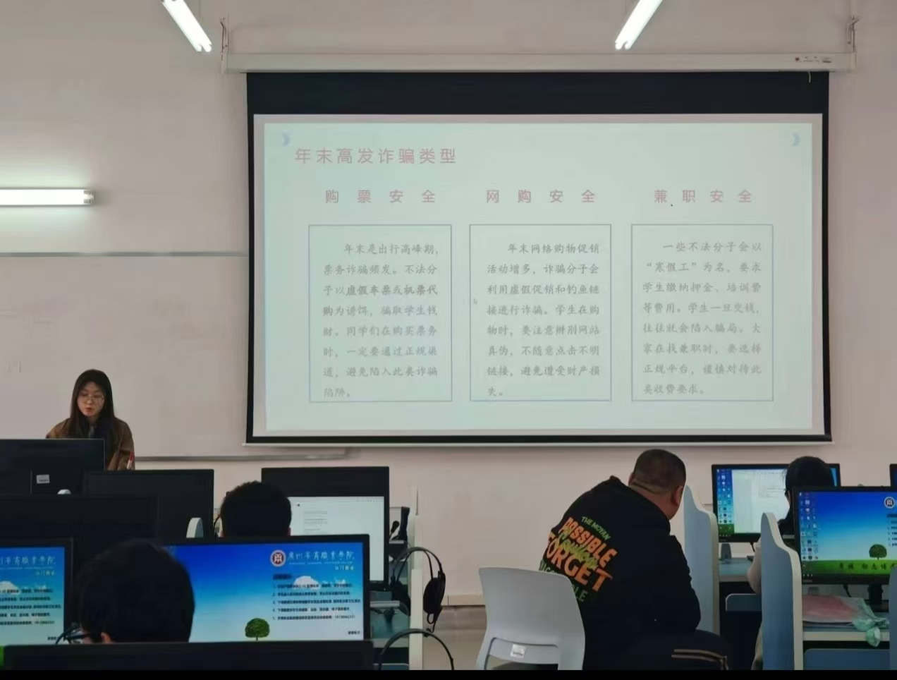 寒假如期而至,为帮助同学们度过一个平安、愉快的假期,低空物流技术学院于1月组织开展了“安全护航寒假”主题班会。班会围绕冬季消防安全、假期交通安全、防诈与求职安全三大板块展开,内容详实,旨在切实增强同学们的安全意识,守护每一位同学平安过冬、安心度假。
